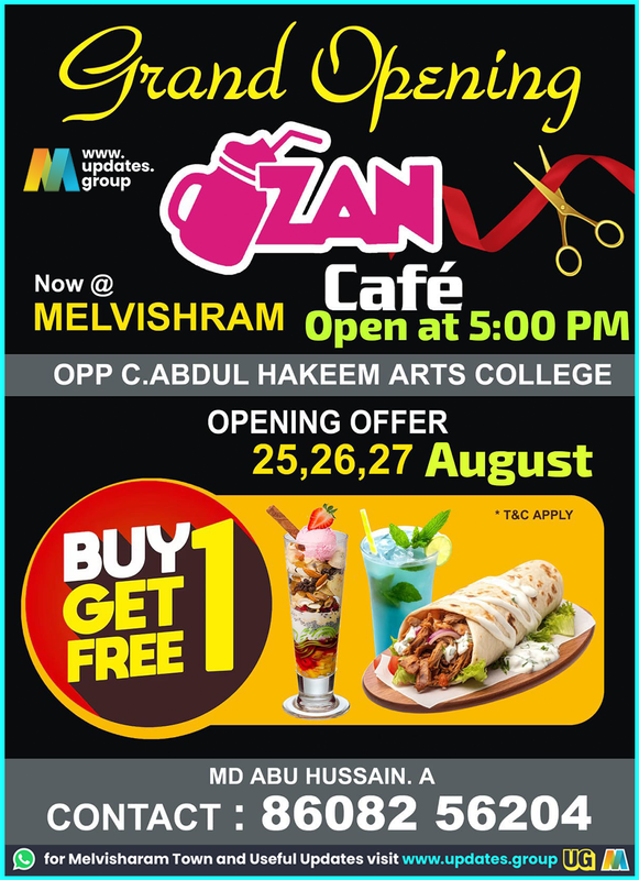 Grand Opening www. updates. group Now @ MELVISHRAM Café Open at 5:00 PM OPP C.ABDUL HAKEEM ARTS COLLEGE OPENING OFFER 25,26,27 August * T&C APPLY BUY GET FREE MD ABU HUSSAIN. A CONTACT: 86082 56204 for Melvisharam Town and Useful Updates visit www.updates.group UG