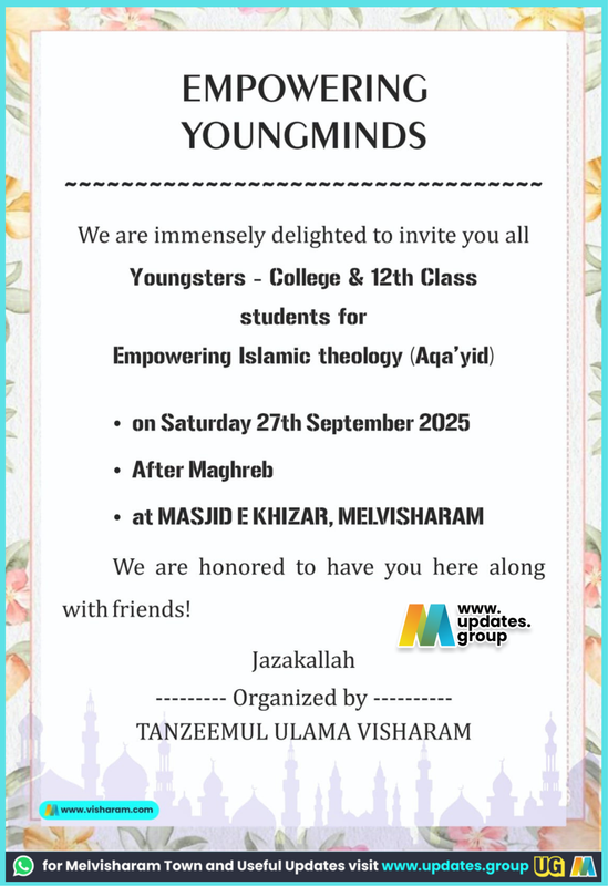 EMPOWERING YOUNGMINDS OOOAAAAAANARAAANARAANAN We are immensely delighted to invite you all Youngsters - College & 12th Class students for Empowering Islamic theology (Aga' yid) • on Saturday 27th September 2025 • After Maghreb • at MASJID E KHIZAR, MELVISHARAM We are honored to have you here along with friends! Jazakallah --- Organized by --------- TANZEEMUL ULAMA VISHARAM www.visharam.com