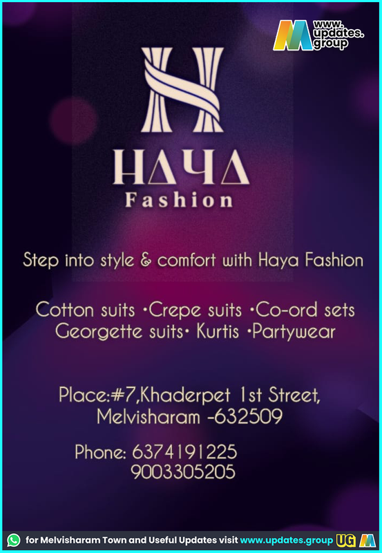 WWW. updates. group НАЧД Fashion Step into style & comfort with Haya Fashion Cotton suits • Crepe suits •Co-ord sets Georgette suits• Kurtis •Partywear Place:#7,Khaderpet Ist Street, Melvisharam -632509 Phone: 6374191225 9003305205 for Melvisharam Town and Useful Updates visit www.updates.group UG