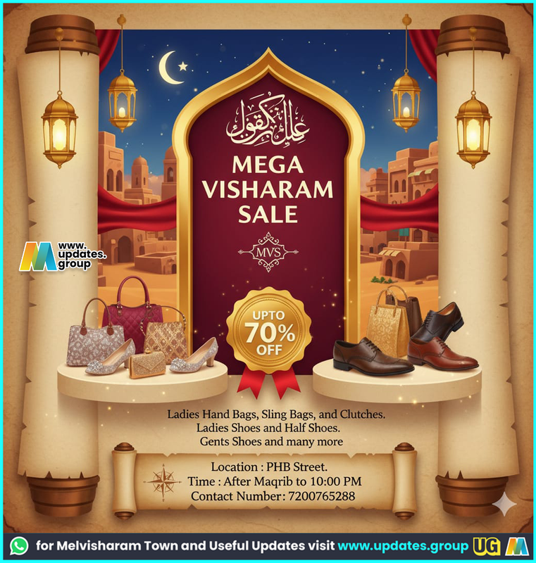 wwW. updates. group عال كقول MEGA VISHARAM SALE MVS 回 UPTO 70% OFF Ladies Hand Bags, Sling Bags, and Clutches. Ladies Shoes and Half Shoes. Gents Shoes and many more Location: PHB Street. Time: After Maqrib to 10:00 PM Contact Number: 7200765288 for Melvisharam Town and Useful Updates visit www.updates.group UG K