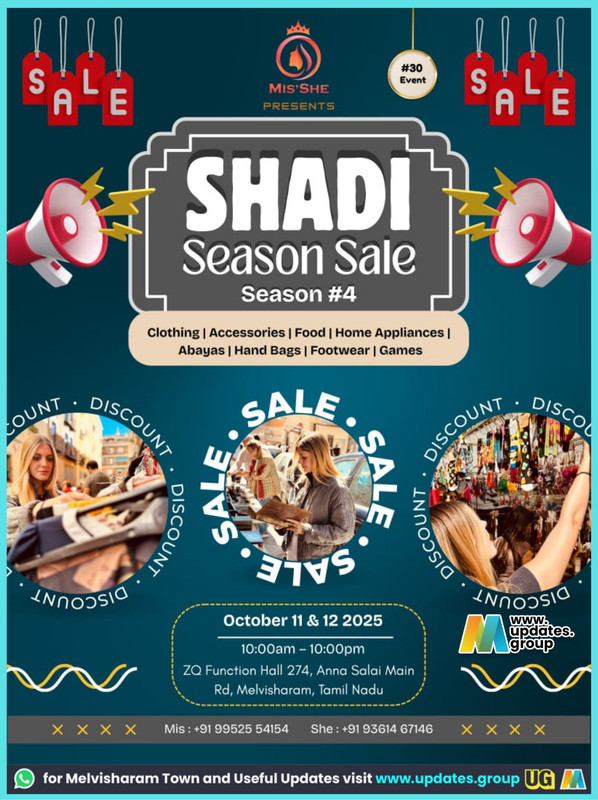 S L #30 Event S E MIS'SHE PRESENTS L E SHADI Season Sale Season #4 Clothing | Accessories | Food | Home Appliances | Abayas | Hand Bags | Footwear | Games 4 SALA • DISCOUNT 1V SALE • IN100510 wwW. updates. group October 11 & 12 2025 10:00am - 10:00pm ZQ Function Hall 274, Anna Salai Main Rd, Melvisharam, Tamil Nadu X X Mis: +91 99525 54154 She: +91 93614 67146 X X for Melvisharam Town and Useful Updates visit www.updates.group UG