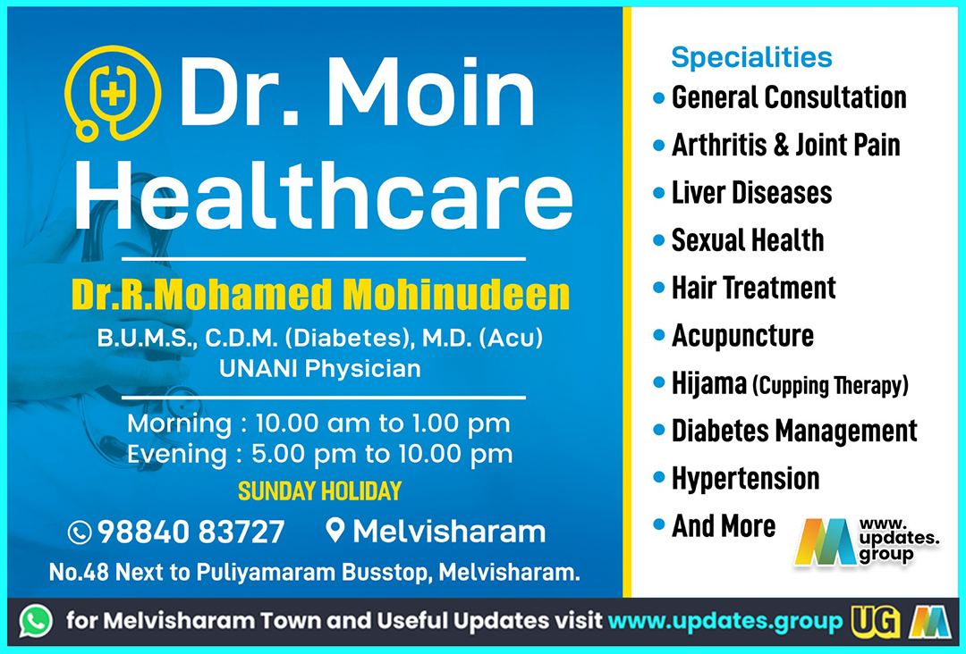 Dr. Moin Healthcare Dr.R.Mohamed Mohinudeen B.U.M.S., C.D.M. (Diabetes), M.D. (Acu) UNANI Physician Morning: 10.00 am to 1.00 pm Evening: 5.00 pm to 10.00 pm SUNDAY HOLIDAY © 98840 83727 ° Melvisharam No.48 Next to Puliyamaram Busstop, Melvisharam. Specialities • General Consultation • Arthritis & Joint Pain • Liver Diseases • Sexual Health • Hair Treatment • Acupuncture • Hijama (Cupping Therapy) • Diabetes Management • Hypertension • And More