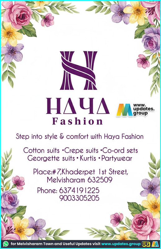 НАЧА Fashion Step into style & comfort with Haya Fashion Cotton suits •Crepe suits •Co-ord sets Georgette suits • Kurtis • Partywear Place:# 7,Khaderpet Ist Street, Melvisharam 632509 Phone: 6374191225 9003305205