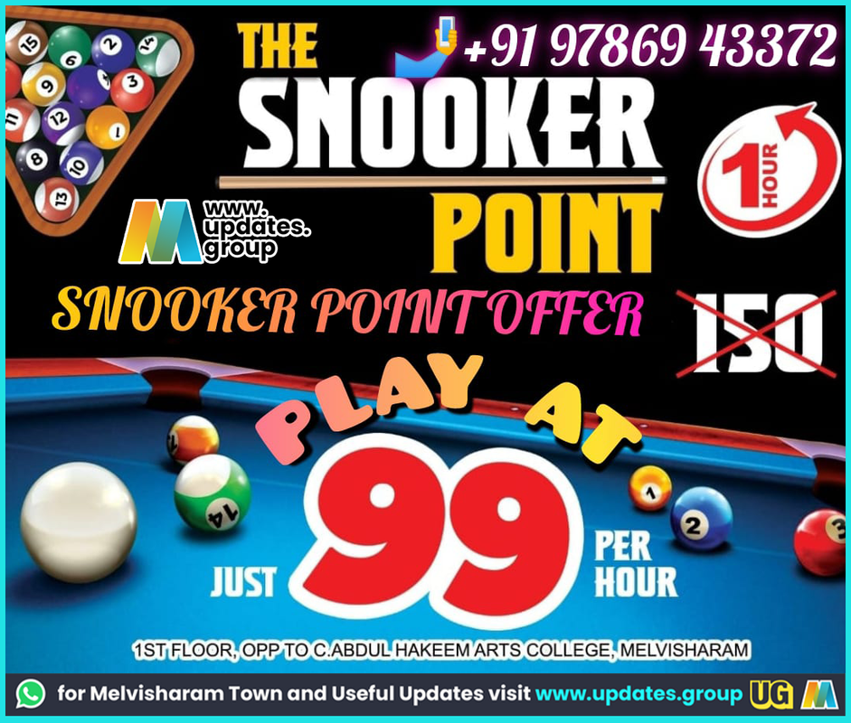 THE +91 97869 43372 SNOOKER M XA wWW. updates. group POINT I SNOOKER POINT OFFER LAYم 4> 2 JUST PER HOUR 1ST FLOOR, OPP TO C.ABDUL HAKEEM ARTS COLLEGE, MELVISHARAM for Melvisharam Town and Useful Updates visit www.updates.group UG K