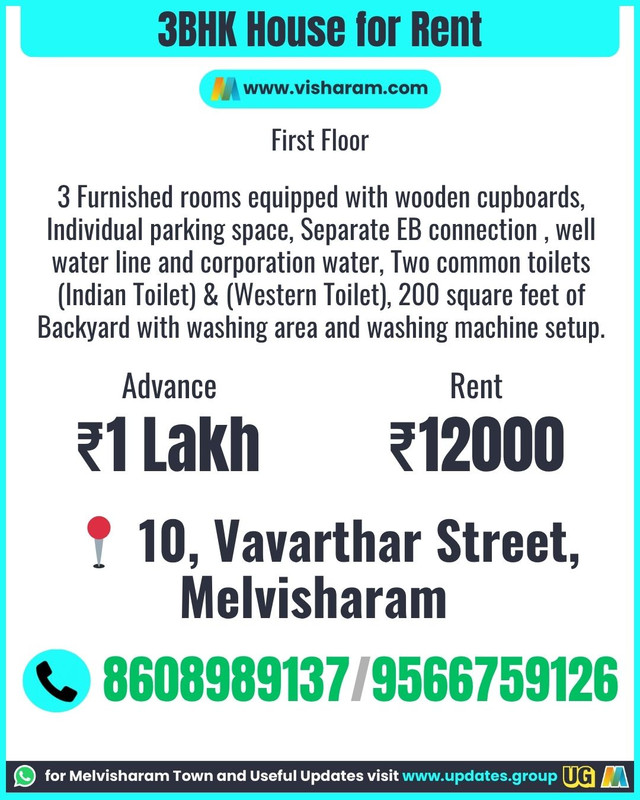 3BHK House for Rent 1. 3 Furnished rooms equipped with wooden cupboards 2. Individual parking space, 3. Separate EB connection , well water line and corporation water 4. Two common toilets (Indian Toilet) & (Western Toilet) 5. 200 square feet of Backyard with washing area and washing machine setup. First Floor Advance - 1 lakh Rent - 12000 Address : 10, Vavarthar Street, Melvisharam Contact: 8608989137 9566759126