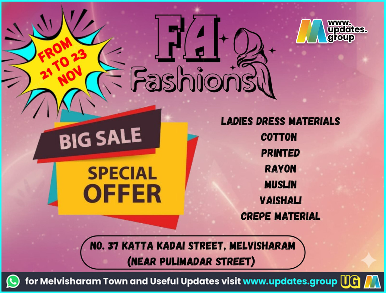 FROM 21 TO 23 FA Fashions! wwW. updates. group BIG SALE SPECIAL OFFER LADIES DRESS MATERIALS COTTON PRINTED RAYON MUSLIN VAISHALI CREPE MATERIAL NO. 37 KATTA KADAI STREET, MELVISHARAM (NEAR PULIMADAR STREET) for Melvisharam Town and Useful Updates visit www.updates.group UG