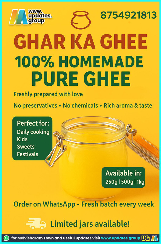 wwW. updates. group 8754921813 GHAR KA GHEE 100% HOMEMADE PURE GHEE Freshly prepared with love No preservatives • No chemicals • Rich aroma & taste Perfect for: Daily cooking Kids Sweets Festivals Available in: 250g | 500g | 1kg Order on WhatsApp - Fresh batch every week • Limited jars available! for Melvisharam Town and Useful Updates visit www.updates.group