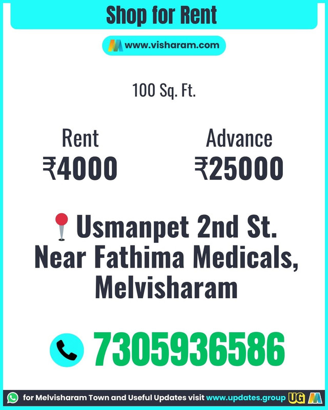 Shop for Rent in Usmanpet 2nd St on November 05, 2025 7305936586 Shop for Rent - 100 Sq. Ft. Rent 4000 Advance 25000 Usmanpet 2nd St. Near Fathima medicals, Melvisharam 7305936586
