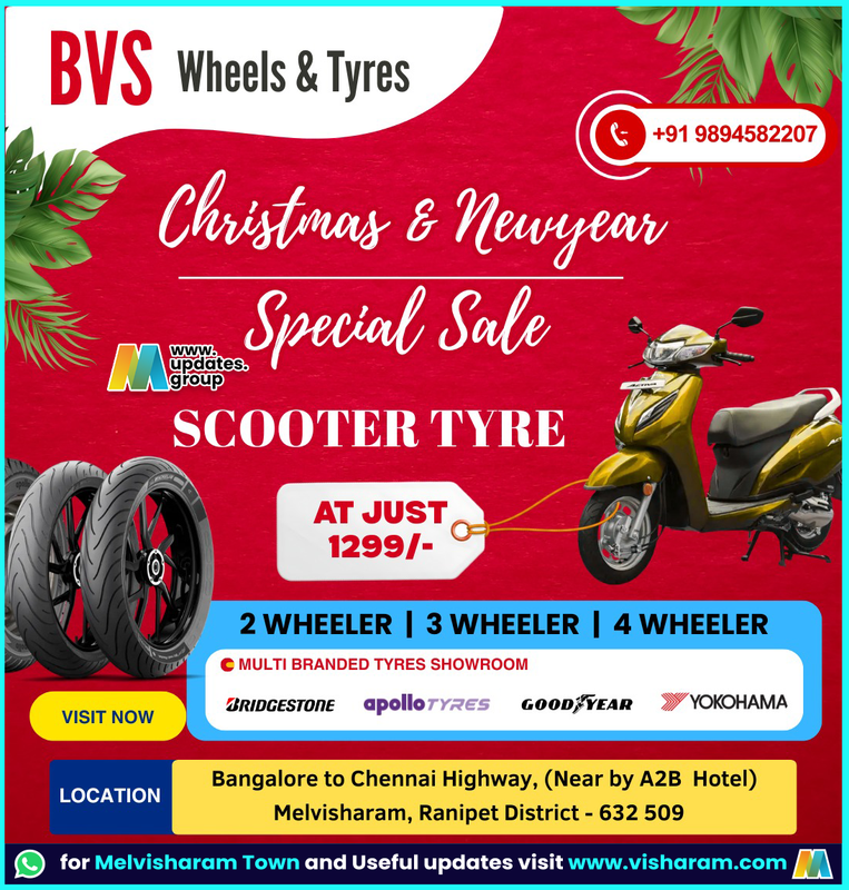 BVS Wheels & Tyres +91 9894582207 Christmas & Newyear WW.Wo updates. Special Sale group SCOOTER TYRE AT JUST 1299/- 2 WHEELER | 3 WHEELER | 4 WHEELER © MULTI BRANDED TYRES SHOWROOM BRIDGESTONE apollotyres GOOD YEAR YOKOHAMA VISIT NOW LOCATION Bangalore to Chennai Highway, (Near by A2B Hotel) Melvisharam, Ranipet District - 632 509 for Melvisharam Town and Useful updates visit www.visharam.com