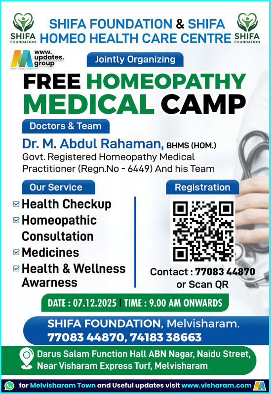 7708344870 SHIFA FOUNDATION & SHIFA HOMOEO HEALTH CARE CENTRE Jointly Organizing a Free Homoeopathy Medical Camp ๐️ Date: 07/12/2025 ⏰ Time: 9:00 AM – 4:00 PM ๐ Venue: Darus Salam, Function Hall ABN Nagar, Naidu Street, Near Visharam Xpress Turf, Melvisharam. ๐Registration:- Call 7708344870 or Fill the form๐ https://forms.gle/RcAFmtPeAnEKERMk6