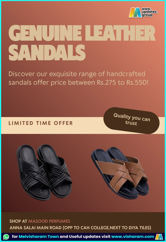 www. updates. group GENUINE LEATHER SANDALS Discover our exquisite range of handcrafted sandals offer price between Rs.275 to Rs.550! LIMITED TIME OFFER Quality you can trust SHOP AT MASOOD PERFUMES ANNA SALAI MAIN ROAD (OPP TO CAH COLLEGE,NEXT TO DIYA TILES) for Melvisharam Town and Useful updates visit www.visharam.com