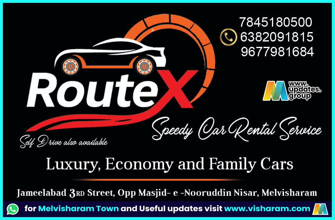7845180500 6382091815 9677981684 RouteX! WWW. updates. group Speedy Oar Rental Service Self Drive also available Luxury, Economy and Family Cars Jameelabad 3RD Street, Opp Masjid- e -Nooruddin Nisar, Melvisharam for Melvisharam Town and Useful updates visit www.visharam.com