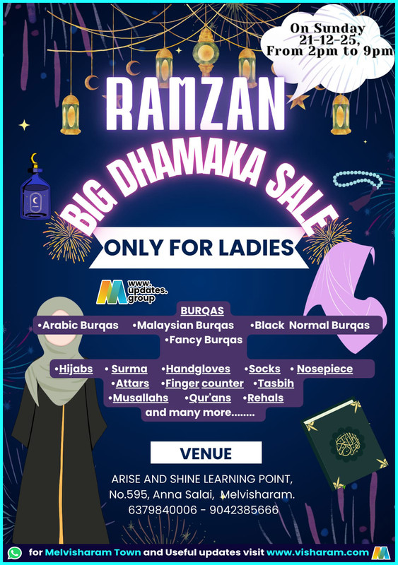 On Sunday 21-12-25; From 2pm to 9pm "RANZANK EONANAN Se, ONLY FOR LADIES WWW. updates. group • Arabic Burqas BURQAS •Malaysian Burqas •Fancy Burqas •Black Normal Burqas •Hijabs • Surma •Handgloves •Socks • Nosepiece •Attars •Finger counter •Tasbih • Musallahs •Qur ans •Rehals and many more..... VENUE ARISE AND SHINE LEARNING POINT, No.595, Anna Salai, Melvisharam. 6379840006 - 9042385666 for Melvisharam Town and Useful updates visit www.visharam.com