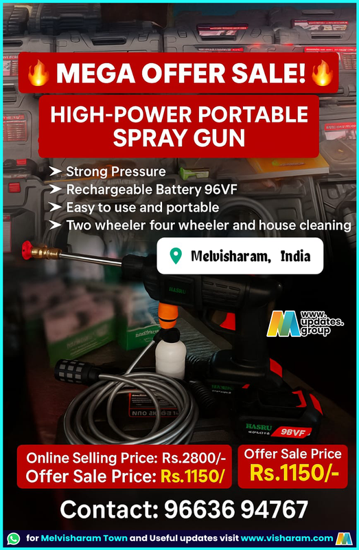MEGA OFFER SALE! HIGH-POWER PORTABLE SPRAY GUN REnDERERCO Strong Pressure Rechargeable Battery 96VF Easy to use and portable > Two wheeler four wheeler and house cleaning Melvisharam, India HASRU Enestinator wwW. updates. group пло ак HASRU KOLOVE 9BVF Online Selling Price: Rs.2800/-Offer Sale Price: Rs.1150/ Offer Sale Price Rs.1150/- Contact: 96636 94767 for Melvisharam Town and Useful updates visit www.visharam.com