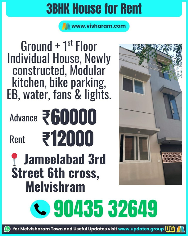 3BHK House for Rent - Ground + First floor Individual House, Newly constructed, Modular kitchen, bike parking, EB, water, fans & lights. Address: Jameelabad 3rd Street 6th cross, Melvishram. Advance: Rs 60000 Rent: Rs 12000 Contact: 9043532649