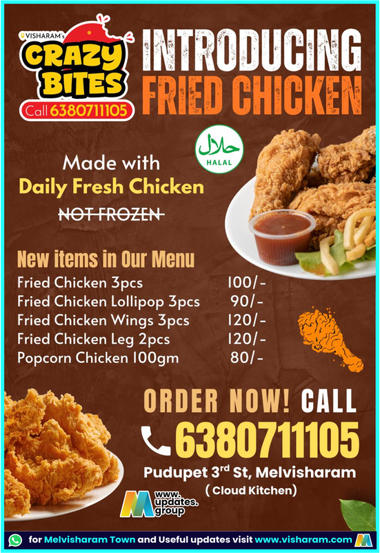 • VISHARAM's CRAZY BITES all 6380711105 INTRODUCING FRIED CHICKEN حلال HALAL 100/- 90/- 120/- 120/- 80/- Made with Daily Fresh Chicken NOT FROZEN New items in Our Menu Fried Chicken 3pcs Fried Chicken Lollipop 3pcs Fried Chicken Wings 3pcs Fried Chicken Leg 2pcs Popcorn Chicken 100gm ORDER NOW! CALL - 6380711105 Pudupet 3rd St, Melvisharam www (Cloud Kitchen) updates. group for Melvisharam Town and Useful updates visit www.visharam.com