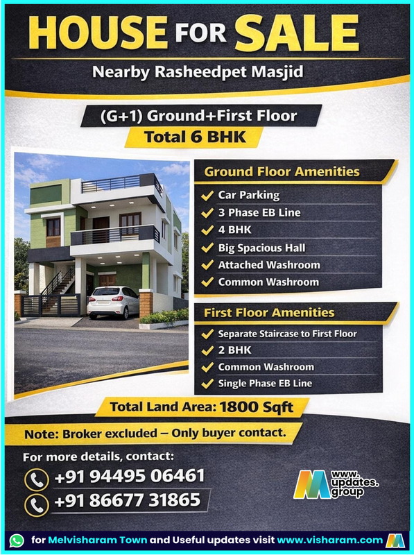 House for Sale – Nearby Rasheedpet Masjid (G+1) Ground+First Floor Total 6 BHK Ground floor Amenities Car parking 3 phase 4 BHK Big Spacious Hall Attached Washroom Common Washroom First Floor Amenities 2 BHK Common Washroom Single Phase Separate Staircase to First Floor Total Land Area: 1800 Sqft Note: Broker excluded – Only buyer contact. For more details, contact. +91 94495 06461 +91 86677 31865