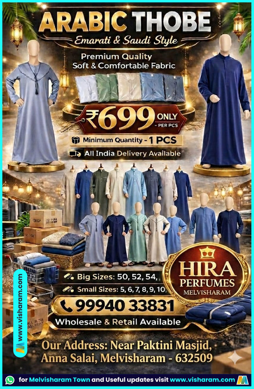 ✨ *Arabic Thobe – Emirati & Saudi Style* ✨ Premium Quality | Soft & Comfortable Fabric 👌 💰 *Only ₹699 per piece* 🛒 Minimum Quantity: 1 Piece 🚚 All India Delivery Available 📏 *Big Sizes:* 50, 52, 54 👦 *Small Sizes:* 5, 6, 7, 8, 9, 10 🏬 *Wholesale & Retail Available* 📍 *Hira Perfumes, Melvisharam* Near Paktini Masjid, Anna Salai, Melvisharam – 632509 📞 *Call / WhatsApp:* 99940 33831 Get ready for Ramadan in style! 🌙