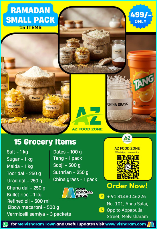 🌙🛒 *Ramadan Small Pack – 15 Grocery Items* 🛒🌙 💰 *Only ₹499/-* Get all your essential Ramadan groceries in one convenient pack from *AZ Food Zone*! 📦 *Includes:* • Salt – 1 kg • Sugar – 1 kg • Maida – 1 kg • Toor dal – 250 g • Urad dal – 250 g • Chana dal – 250 g • Bullet rice – 1 kg • Refined oil – 500 ml • Elbow macaroni – 500 g • Vermicelli (Semiya) – 3 packets • Dates – 100 g • Tang – 1 pack • Sooji – 500 g • Suthrian – 250 g • China grass – 1 pack 📍 *AZ Food Zone* No. 101, Anna Salai, Opp to Appapullai Street, Melvisharam 📞 *Order Now:* +91 81480 46226 Limited stock – Book yours today! 🌙✨ For Melvisharam town updates, visit: [www.visharam.com](http://www.visharam.com)