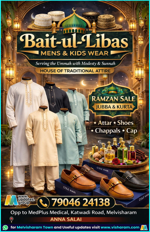 ๐✨ *Bait-ul-Libas – Mens & Kids Wear* ✨๐ Serving the Ummah with Modesty & Sunnah ๐ *Ramzan Sale – Jubba & Kurta* ๐งด Attar ๐ Shoes ๐ฉด Chappals ๐งข Cap House of Traditional Attire – Premium Quality Collections for Men & Kids. ๐ Contact: 79046 24138 ๐ Opp to MedPlus Medical, Katwadi Road, Anna Salai, Melvisharam Visit us this Ramzan and shop the best traditional collections! ๐๐ For Melvisharam town updates, visit: [www.visharam.com](http://www.visharam.com)