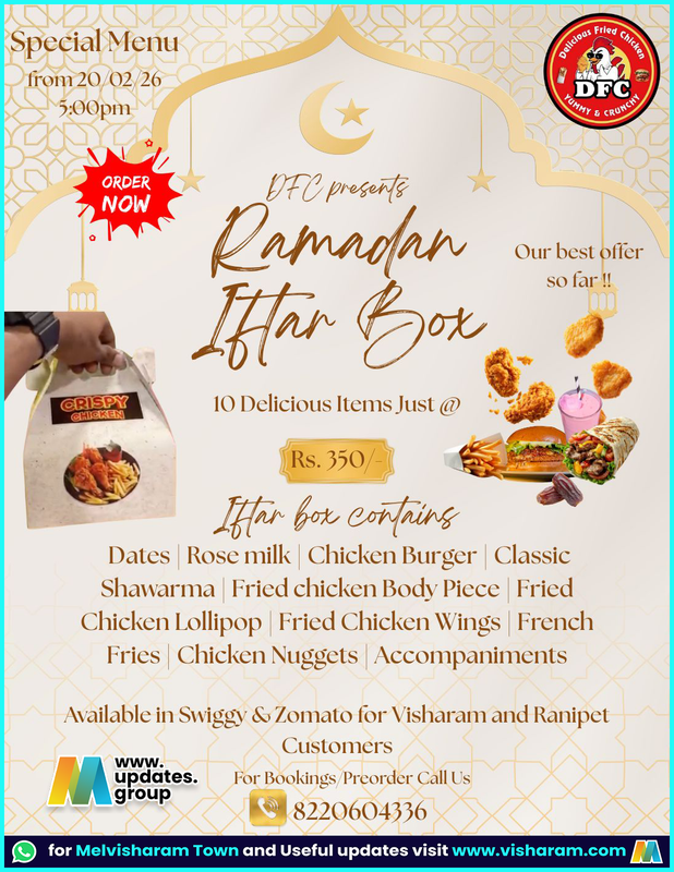 🌙 *Ramadan Special Iftar Box by DFC* 🍱 Enjoy a delicious Iftar with *10 tasty items* for just *Rs. 350/-* 🤩 Starting from *20/02/2026 | 5:00 PM* ✨ *Iftar Box Includes:* • Dates • Rose Milk • Chicken Burger • Classic Shawarma • Fried Chicken Body Piece • Chicken Lollipop • Chicken Wings • French Fries • Chicken Nuggets • Accompaniments 📍 Available on *Swiggy & Zomato* for *Melvisharam & Ranipet* 📞 *Pre-Order Now:* 8220604336 Limited Time Offer – Book Your Iftar Box Today!