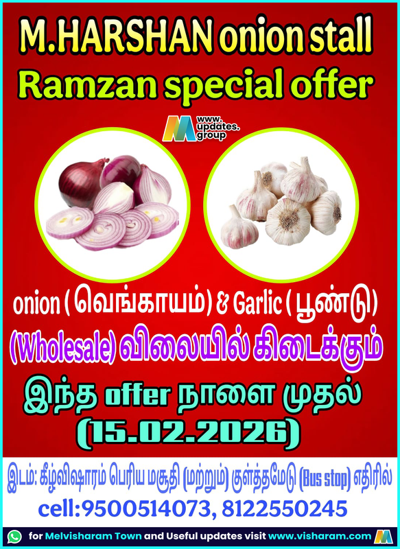 🧅🧄 M. HARSHAN Onion Stall – Ramzan Special Offer 🌙✨ Onion (வெங்காயம்) & Garlic (பூண்டு) Available at Wholesale Price 🔥 💥 Special Ramzan Offer 📅 Offer valid till: 15-02-2026 🏪 Location: Kilvisharam Periya Masjid (Opp.) Bus Stop area 📞 Contact: 9500514073 8122550245 Stock up for Ramzan cooking – Don’t miss this special wholesale offer! Please share with family & friends 🙌