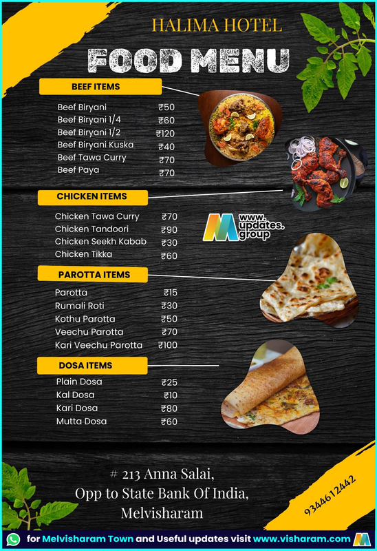🟡 HALIMA HOTEL – FOOD MENU 🍽️ Halima Hotel – Fresh & Tasty Food Menu! Now Available: 🥩 Beef Items: ✔️ Beef Biriyani ✔️ Beef Kuska ✔️ Beef Tawa Curry ✔️ Beef Paya 🍗 Chicken Items: ✔️ Chicken Tawa Curry ✔️ Chicken Tandoori ✔️ Chicken Seekh Kabab ✔️ Chicken Tikka 🥙 Parotta Items: ✔️ Parotta ✔️ Rumali Roti ✔️ Kothu Parotta ✔️ Veechu Parotta ✔️ Kari Veechu Parotta 🥞 Dosa Items: ✔️ Plain Dosa ✔️ Kal Dosa ✔️ Kari Dosa ✔️ Mutta Dosa 📍 #213 Anna Salai, Opp to State Bank of India, Melvisharam 📞 Contact: 9344612442