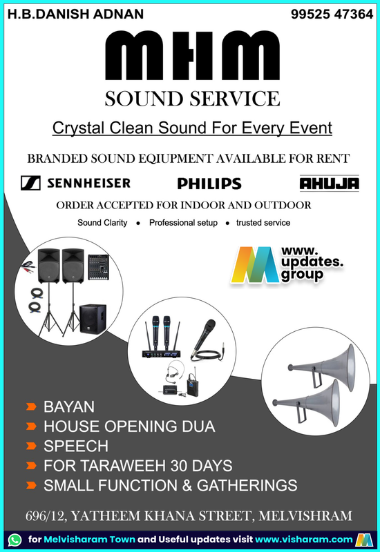 🎤🔊 MHM Sound Service – Crystal Clear Sound for Every Event 👤 H.B. Danish Adnan 📞 99525 47364 🎶 Branded Sound Equipment Available for Rent (Sennheiser | Philips | Ahuja) ✅ Indoor & Outdoor Orders Accepted • Sound Clarity • Professional Setup • Trusted Service 📌 Services Available For: ➡️ Bayan ➡️ House Opening Dua ➡️ Speech Programs ➡️ Taraweeh (30 Days) ➡️ Small Functions & Gatherings 📍 696/12, Yatheem Khana Street, Melvisharam Book now for hassle-free and high-quality sound service for your event!