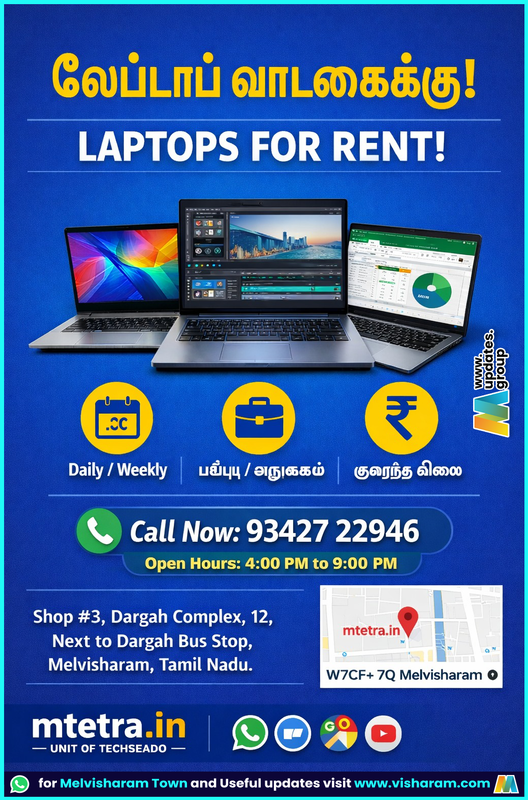 💻 LAPTOPS FOR RENT – Melvisharam! Need a laptop for short-term use? We’ve got you covered! ✅ 📅 Available on: ✔ Daily Basis ✔ Weekly Basis ✔ Monthly Basis 💼 Perfect for: • Office Work • Students • Online Exams • Projects & Training • Temporary Requirements 💰 Affordable Rental Prices 📞 Call Now: 93427 22946 🕓 Open Hours: 4:00 PM – 9:00 PM 📍 Shop #3, Dargah Complex, Next to Dargah Bus Stop, Melvisharam, Tamil Nadu. 🌐 Visit: mtetra.in Limited stock available – Book yours today!
