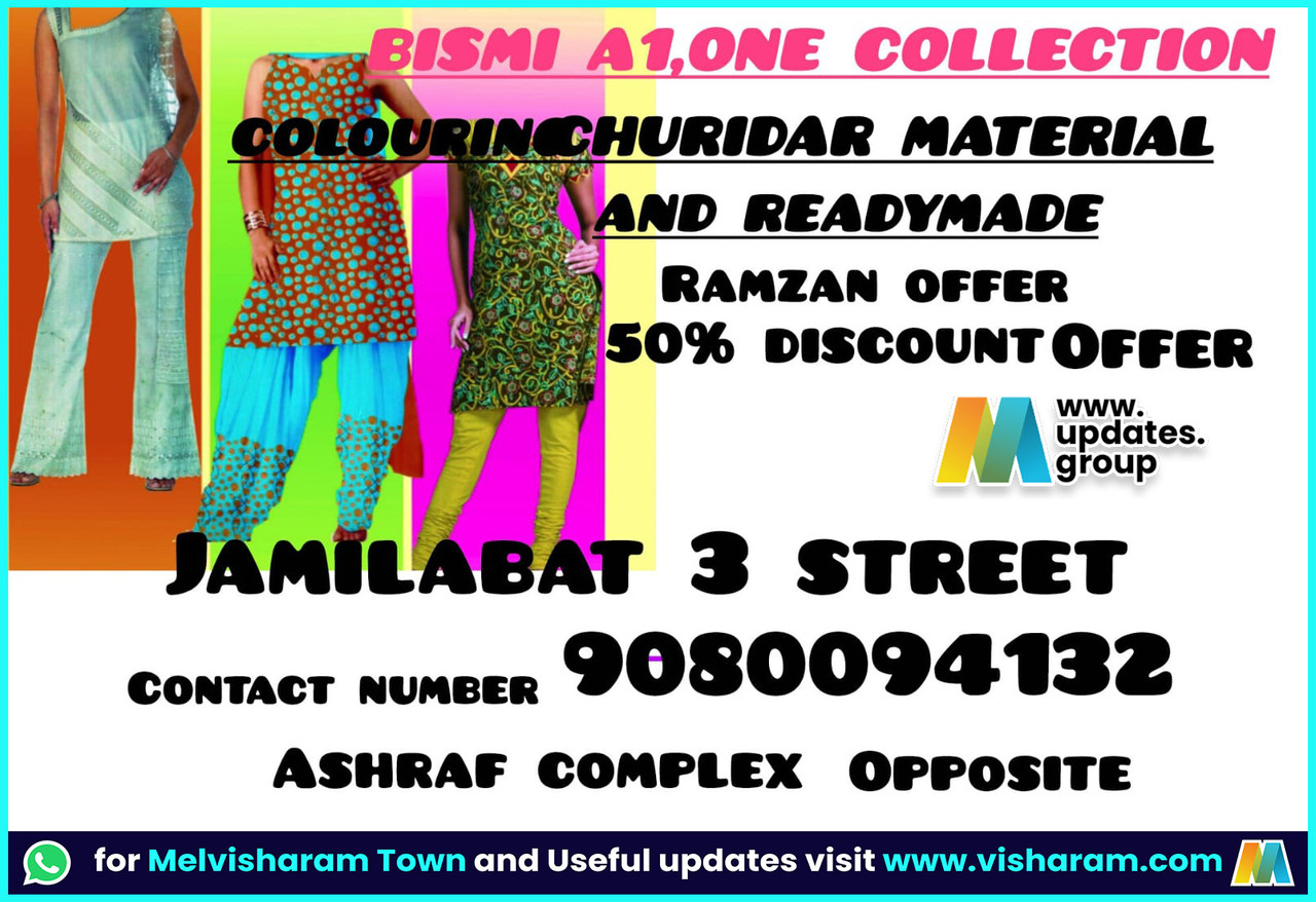 🌙 *Ramzan Special Offer @ Bismi A1, One Collection!* 🛍️ 👗 Colouring Churidar Materials & Readymade Available 🔥 *Flat 50% Discount* on Ramzan Offer! 📍 *Address:* Jamilabat 3rd Street, Opp. Ashraf Complex, Melvisharam 📞 *Contact:* 9080094132 Don’t miss this festive shopping deal for Ramzan! ✨ For Melvisharam town updates, visit: [www.visharam.com](http://www.visharam.com)