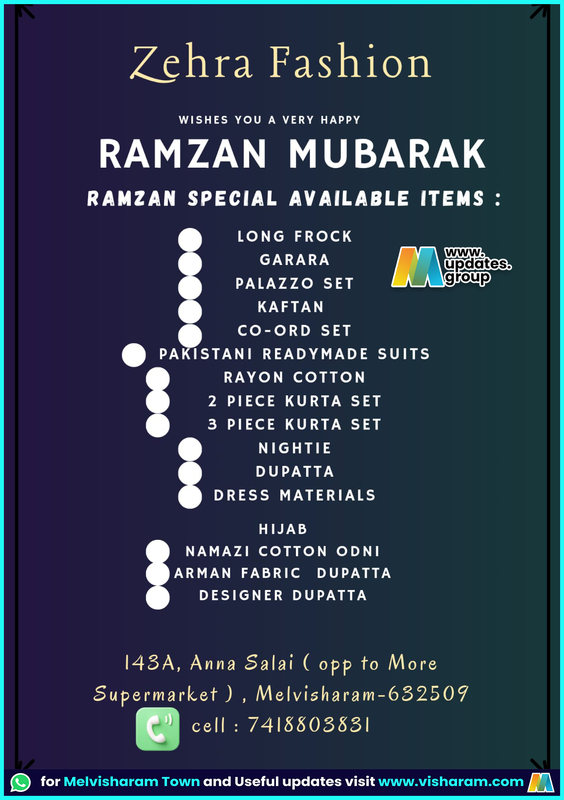 ✨ Zehra Fashion – Ramzan Mubarak! ✨ Celebrate this Ramzan with our Special Collection now available in-store: 👗 Long Frock 👗 Garara 👗 Palazzo Set 👗 Kaftan 👗 Co-ord Set 👗 Pakistani Readymade Suits 👗 Rayon Cotton 👗 2 Piece Kurta Set 👗 3 Piece Kurta Set 👗 Nightie 👗 Dupatta 👗 Dress Materials 🧕 Hijab 🧕 Namazi Cotton Odni 🧣 Arman Fabric Dupatta 🧣 Designer Dupatta 📍 143A, Anna Salai (Opp to More Supermarket), Melvisharam – 632509 📞 7418803831 Visit Zehra Fashion for your perfect Ramzan outfits! 🌙🛍️