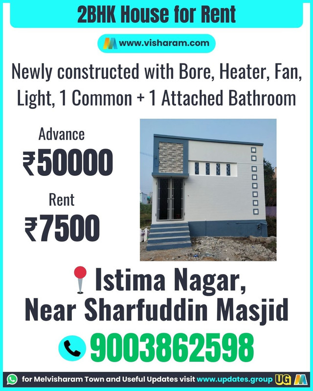 2BHK House for Rent Newly constructed with Bore, Heater, Fan, Light, 1 Common + 1 Attached Bathroom Rent ₹7500 Advance ₹50000 9003862598 Istima Nagar, Near Sharfuddin Masjid