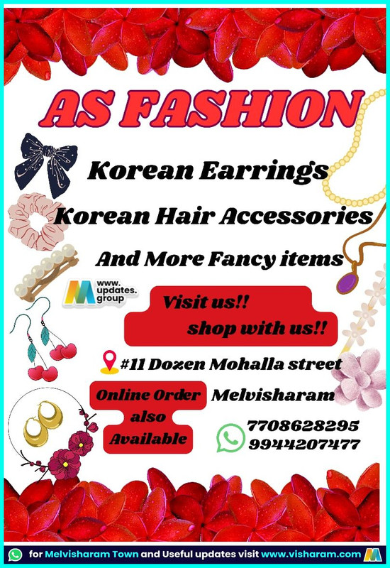 ✨ *AS Fashion – Trendy Accessories* ✨ 💎 Korean Earrings 🎀 Korean Hair Accessories 💖 And Many More Fancy Items 🛍 *Visit Us & Shop With Us!* 📍 #11, Dozen Mohalla Street, Melvisharam 📦 *Online Orders Also Available* 📞 Contact / WhatsApp: 77086 28295 99442 07477 Discover the latest trendy accessories today! 💫 For Melvisharam town updates, visit: [www.visharam.com](http://www.visharam.com)