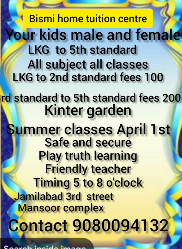 📚 Bismi Home Tuition Centre – Melvisharam Classes available for Boys & Girls 👦👧 LKG to 5th Standard 📖 All subjects covered 🕓 Ramzan Timing: 2 PM – 5 PM 🕔 After Ramzan: 5 PM – 7 PM ✨ Personalized teaching ✨ Extra free classes during exams 💰 Fees: • LKG – 2nd Standard: ₹100 • 3rd – 5th Standard: ₹300 📍 Jamilabad 3rd Street Mansoor Complex 📞 90800 94132 Ladies enquiries only.