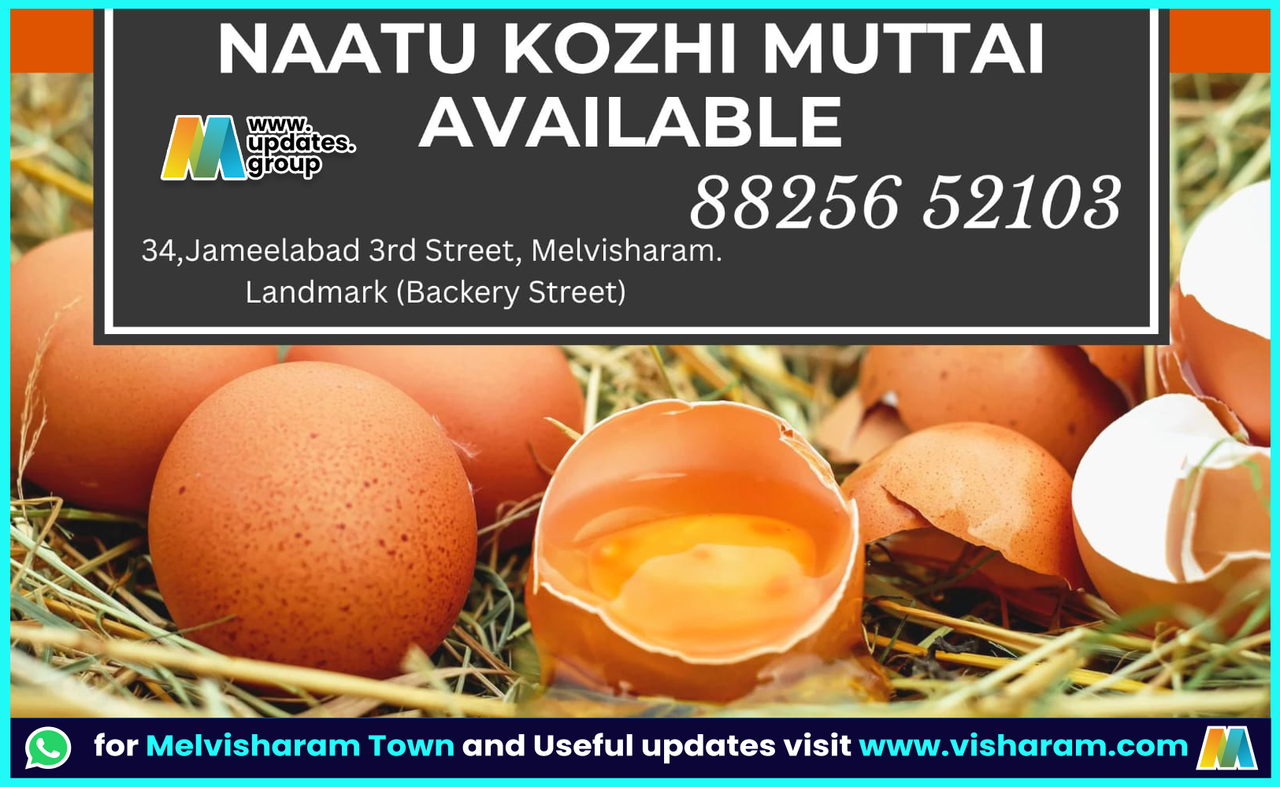 🥚 *Naattu Kozhi Muttai Available* 🥚 Fresh Country Chicken Eggs Available. 📍 *Address:* 34, Jameelabad 3rd Street, Melvisharam (Landmark: Backery Street) 📞 *Contact:* 88256 52103 Get fresh and healthy country eggs daily! For Melvisharam town updates, visit: [www.visharam.com](http://www.visharam.com)