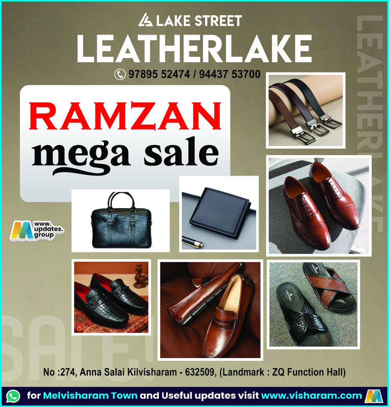 👜👞 *Leatherlake – Ramzan Mega Sale!* 👞👜 Premium Leather Collections Available: 👞 Shoes 🩴 Chappals 👔 Belts 👛 Wallets 🧳 Bags & More Upgrade your style this Ramzan with quality leather products! 📍 *Address:* No: 274, Anna Salai, Kilvisharam – 632509 (Landmark: ZQ Function Hall) 📞 Contact: 97895 52474 / 94437 53700 Visit now and grab the best Ramzan offers! 🌙✨ For Melvisharam town updates, visit: [www.visharam.com](http://www.visharam.com)