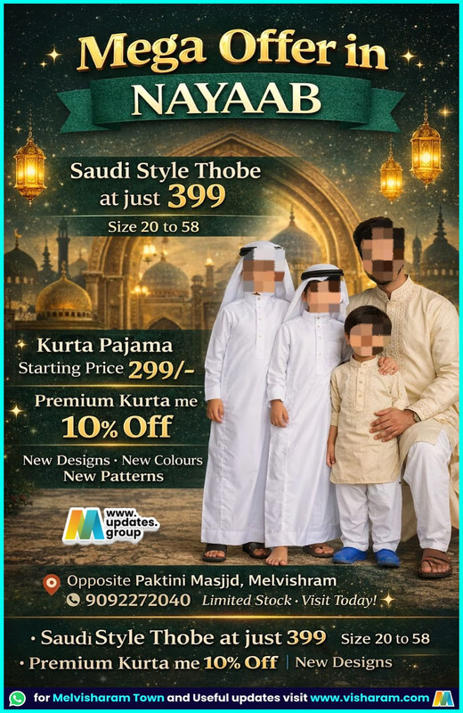 ✨ Mega Offer at NAYAAB – Melvisharam 👕 Saudi Style Thobe Only ₹399 Sizes 20 – 58 👔 Kurta Pajama Starting from ₹299 🔥 Premium Kurtas – 10% OFF ✔ New Designs ✔ New Colours ✔ New Patterns 📍 Opposite Paktini Masjid Melvisharam 📞 9092272040 ⚡ Limited Stock – Visit Today!