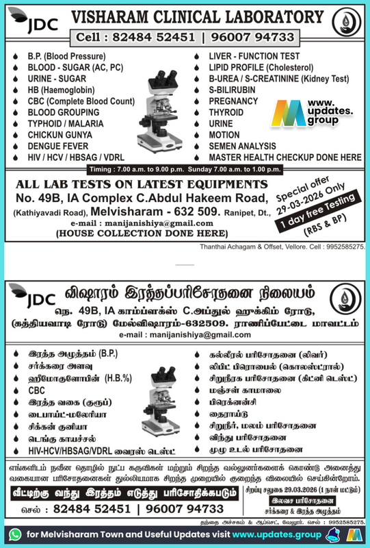 ๐งช๐ฌ Visharam Clinical Laboratory ๐ฌ๐งช Accurate & Reliable Lab Tests with Latest Equipment ๐ฉบ Available Tests: • B.P (Blood Pressure) • Blood Sugar (AC, PC) • Urine Sugar • Hemoglobin (HB) • CBC (Complete Blood Count) • Blood Grouping • Typhoid / Malaria • Chickungunya • Dengue Fever • HIV / HCV / HBSAG / VDRL • Liver Function Test • Lipid Profile (Cholesterol) • Kidney Test (Urea / Creatinine) • S-Bilirubin • Pregnancy Test • Thyroid • Urine / Motion • Semen Analysis • Master Health Checkup ⏰ Timing: 7:00 AM – 9:00 PM (Sunday: 7:00 AM – 1:00 PM) ๐ House Collection Available ๐ Address: No. 49B, IA Complex, C. Abdul Hakeem Road (Kathiyavadi Road), Melvisharam – 632 509 ๐ Contact: 82484 52451 / 96007 94733 ๐ Special Offer: 1 Day Free Testing (RBS & BP) Your health is our priority! ๐ ๐ for Melvisharam Town and Useful updates visit join.visharam.com